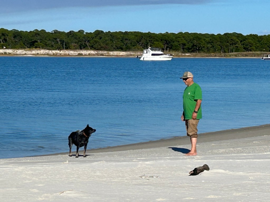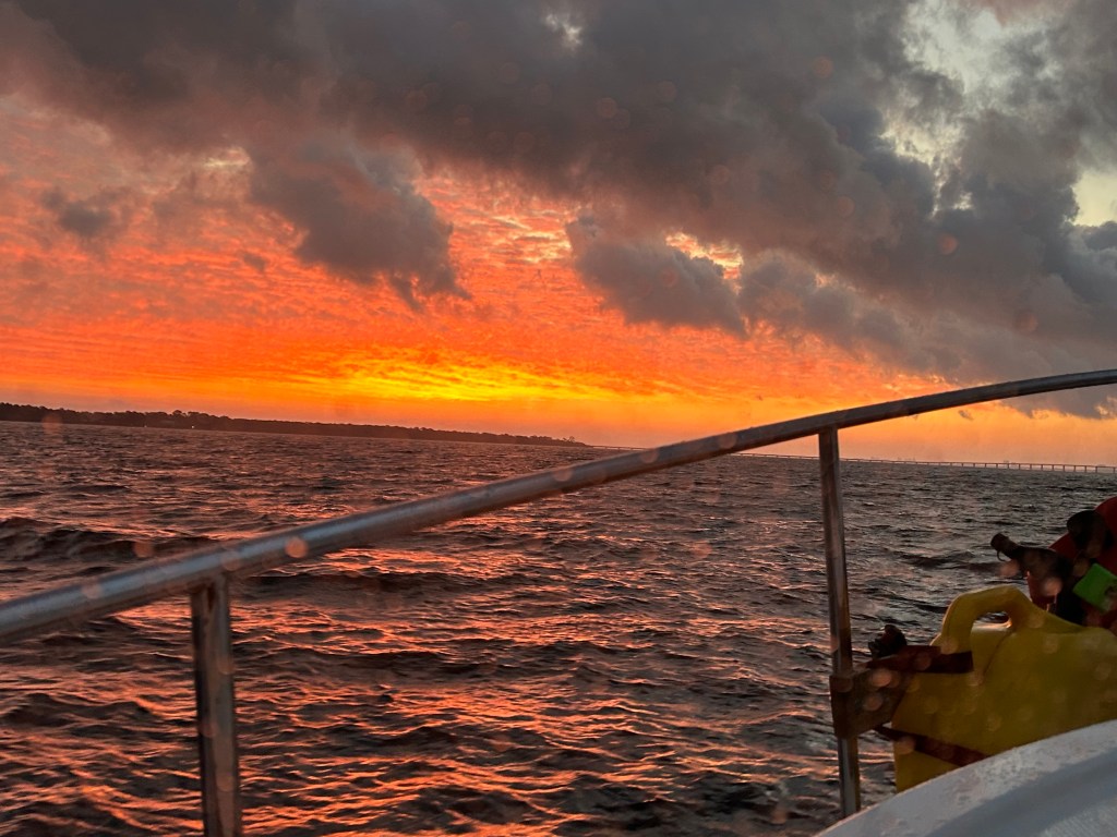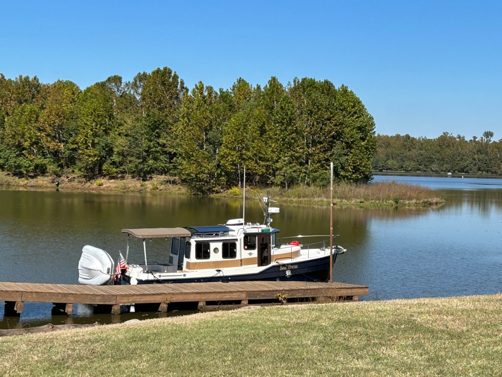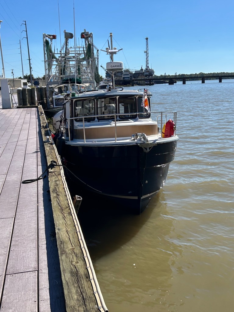 Okay, I have been lazy and remiss in posting updates. It has been a couple of weeks with slow progress and being held up by bad weather. We travelled from Navarre Beach to Rocky Bayou near Niceville, Florida. Peaceful and calm. When we left Rocky Bayou, we got our first taste of spicy seas and we moved down to Smack Bayou, another beautiful anchorage. The winds were forecast to be 15 to 20 mph so we moved to a marina in Panama City. We were on a fixed dock with pilings and no breakwater. What we didn’t know is that we would be rocking in our slip for three days. It was interesting to have to jump from a moving boat onto a narrow finger that was three feet higher than the boat! We spent Thanksgiving there with the staff and other loopers!